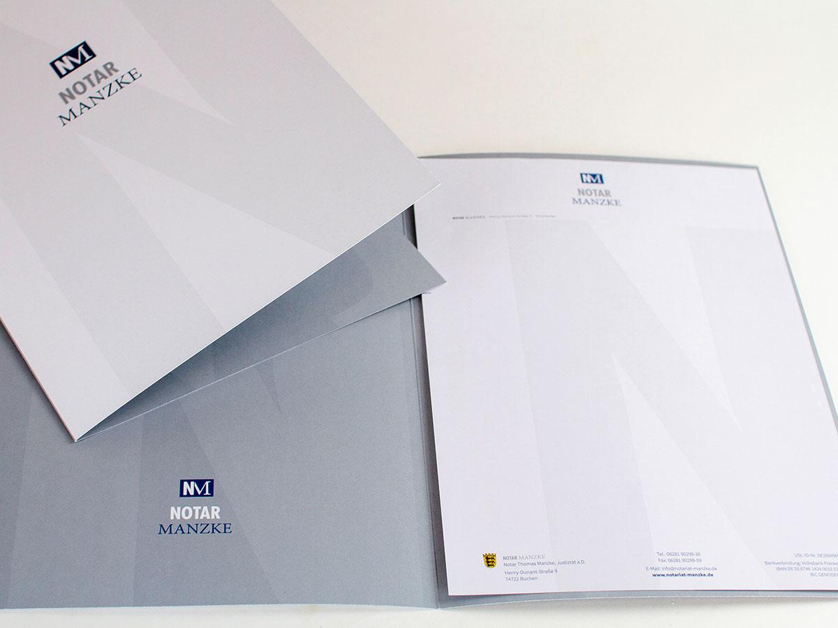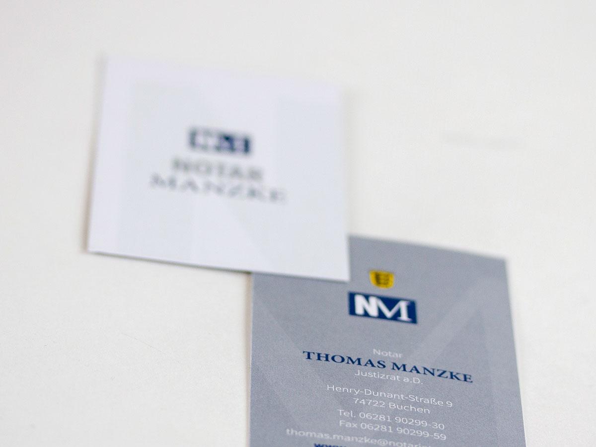 Durch diese Änderung erhielten wir den Auftrag, für das passende Gesicht für das Notariat Manzke in Buchen zu sorgen. Neben einem individuellen Logo entstand in unserem Hause die komplette Geschäftsausstattung.