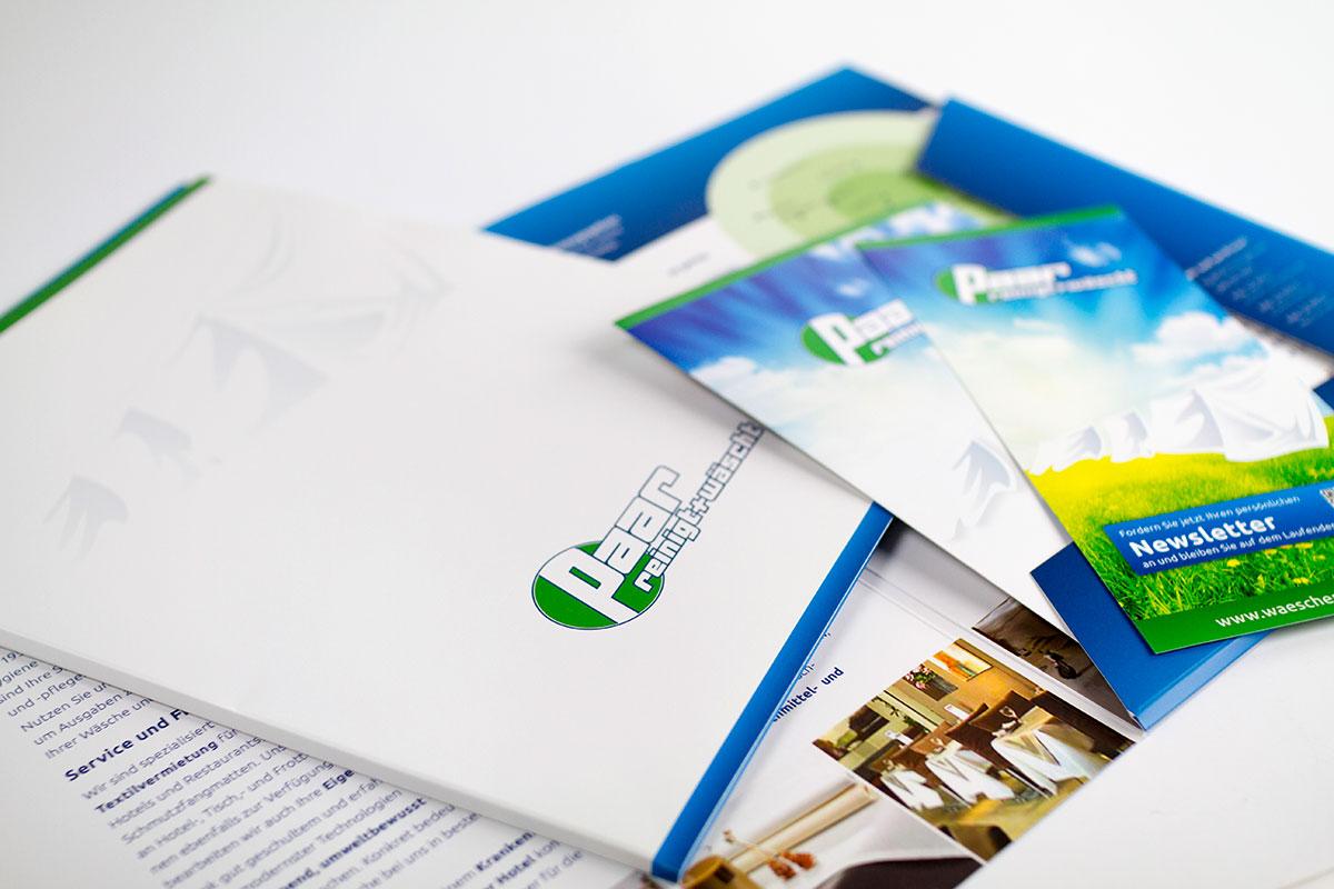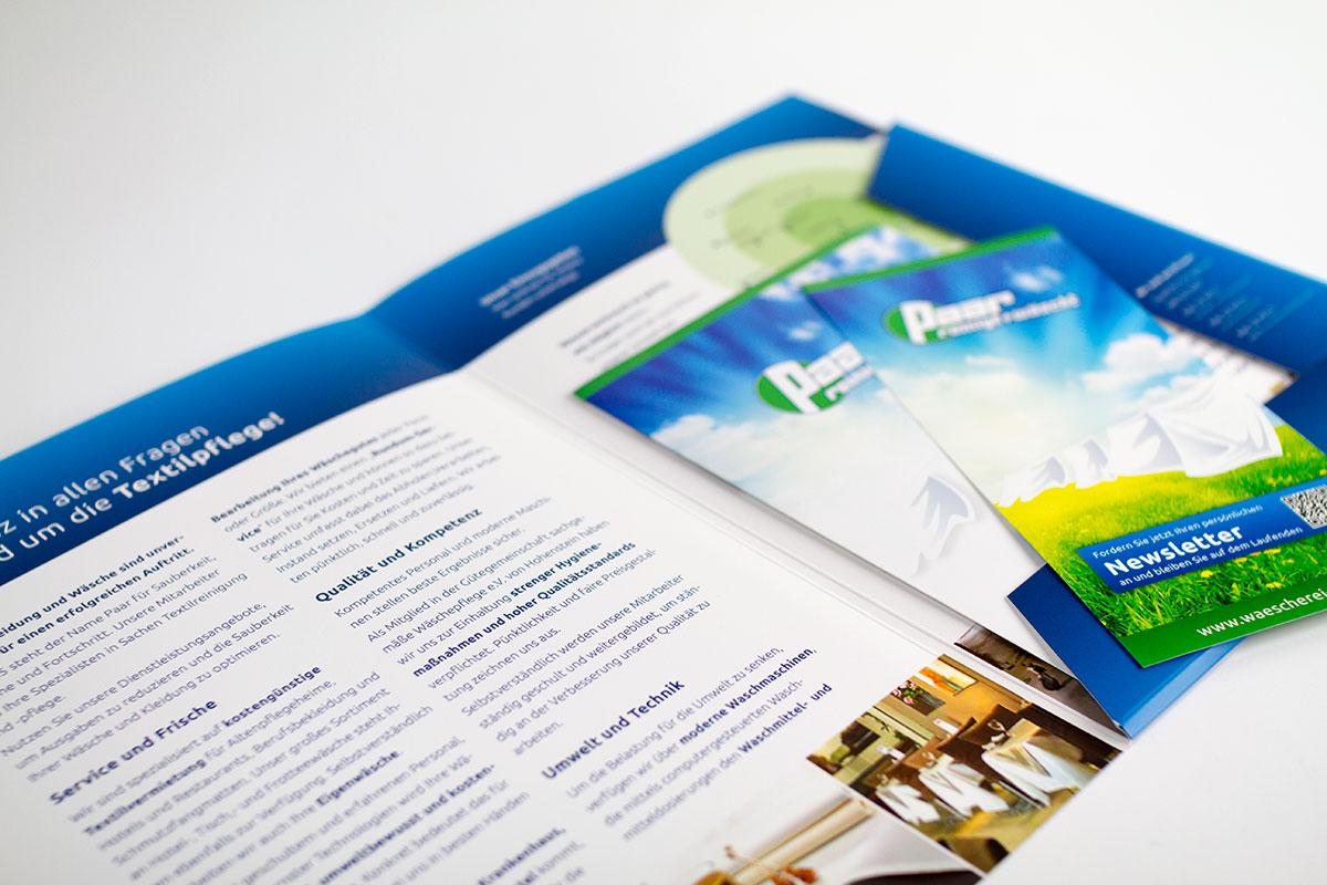 Damit diese Botschaft bestens bei den Wäscherei-Kunden ankommt, dafür haben wir gesorgt - mit einer entsprechenden Geschäftsausstattung, Briefbögen, Visitenkarten, einer Angebotsmappe und verschiedenen zielgruppen-gerechten Flyern.