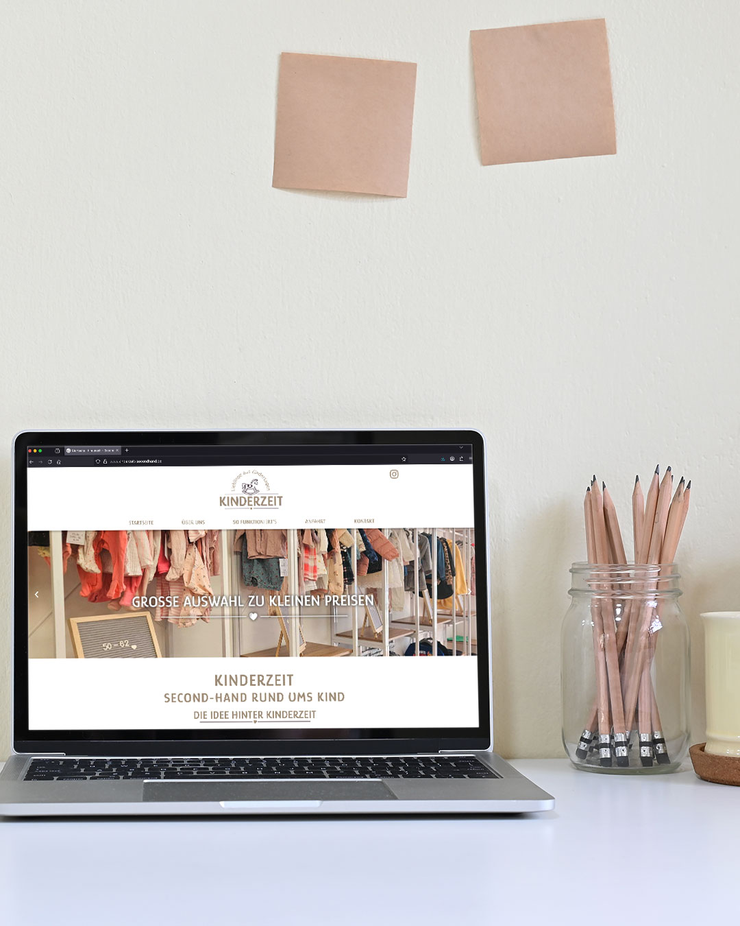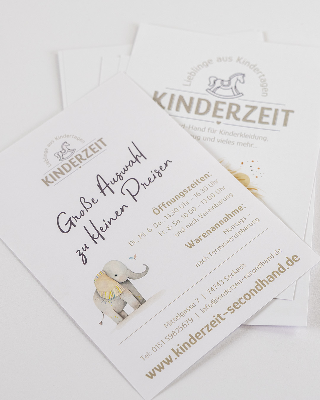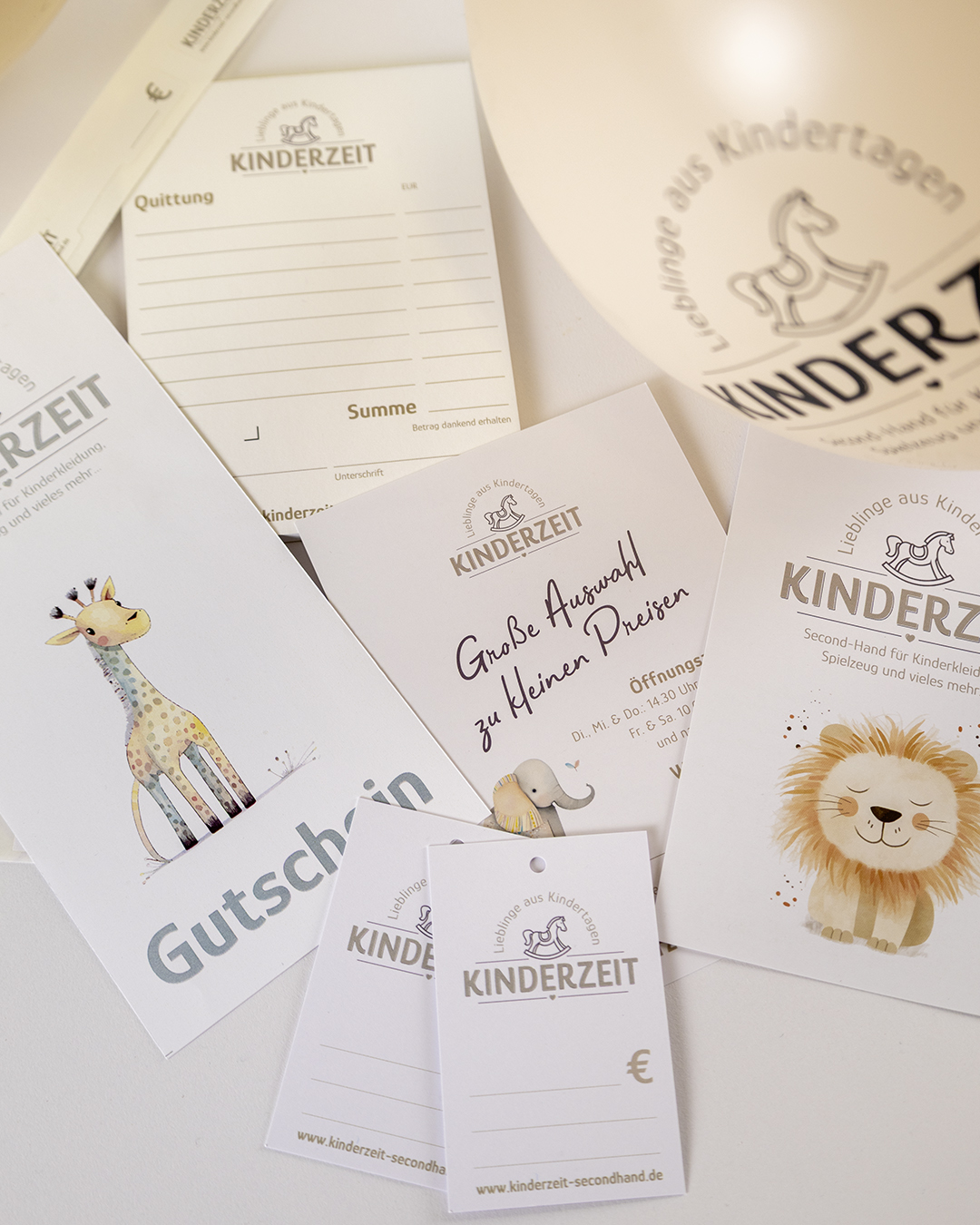 Für den liebevoll geführten Second-Hand-Laden Kinderzeit durften wir ein rundum stimmiges Gesamtpaket gestalten. Vom Außenauftritt über die Website bis hin zu Etiketten, Flyern, Quittungsblöcken, Gutscheinen und sogar gebrandeten Luftballons und alles wurde individuell auf das Konzept abgestimmt.
