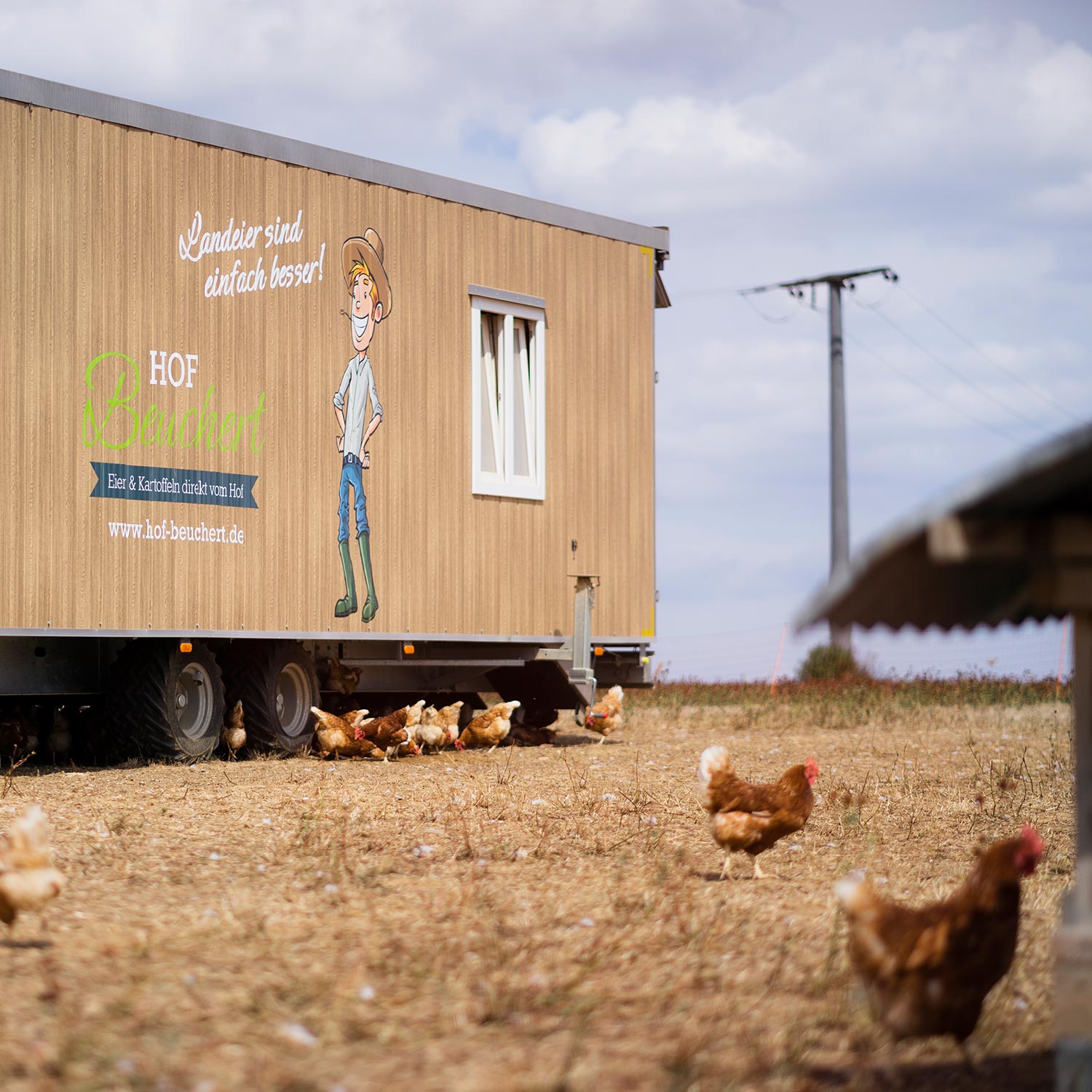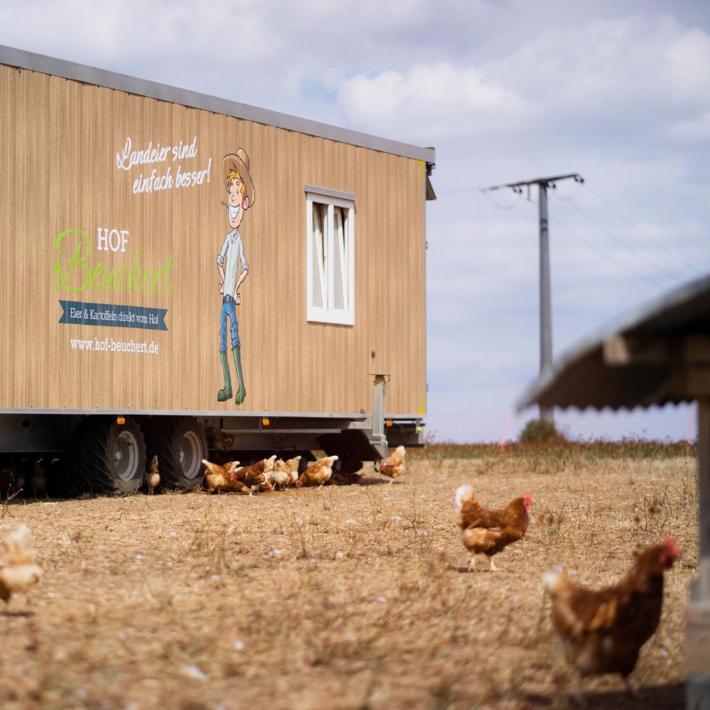 Bei Beucherts gibt es seit einigen Monaten frische Hühnereier und (schon länger) Kartoffeln direkt vom Hof. Zusätzlich gibt es dort mittlerweile auch Nudeln. Schon von Weitem kann man den mobilen Hühnerstall erkennen, wenn man entlang der L582 von Buchen nach Eberstadt fährt. Wer den Hühnern beim Picken zuschauen möchte, kann das aus sicherer Entfernung gerne tun. Die eigentliche Verkaufsstelle liegt direkt am Hof und ist gut beschildert.