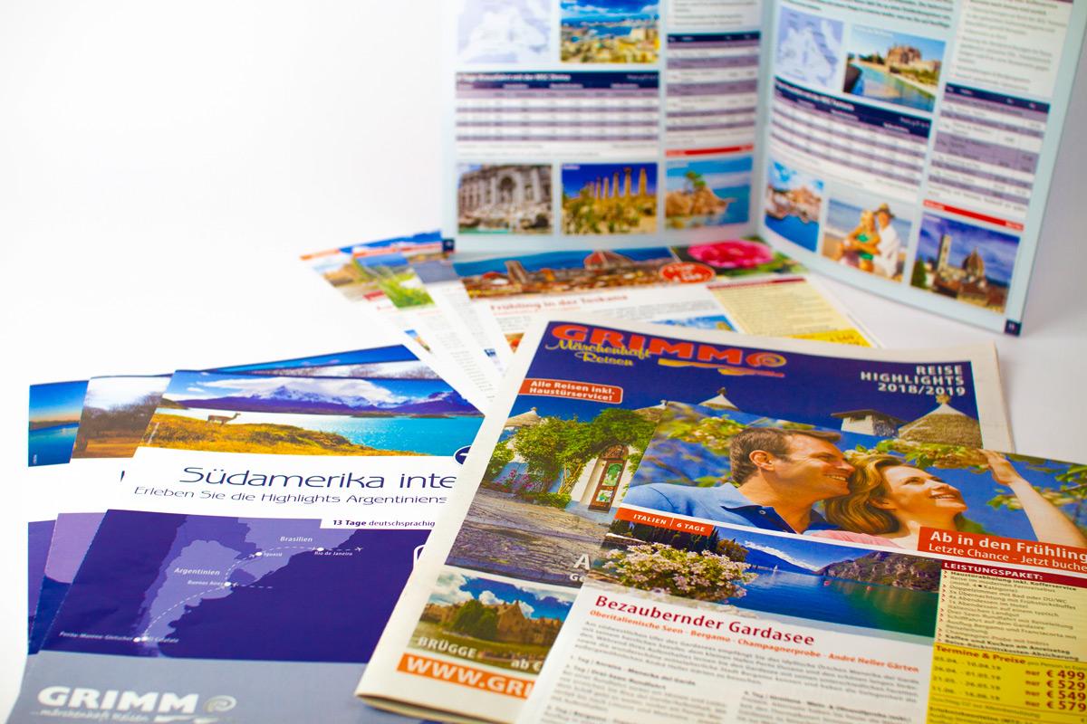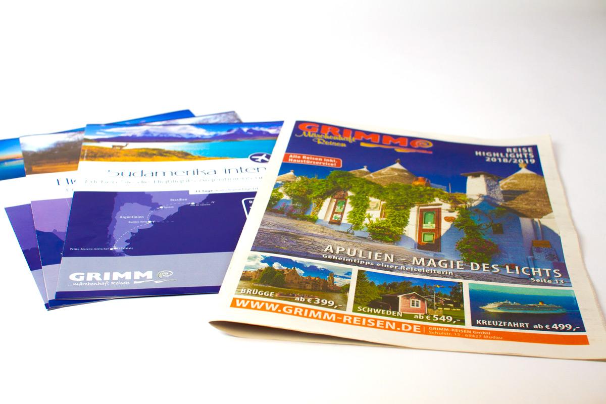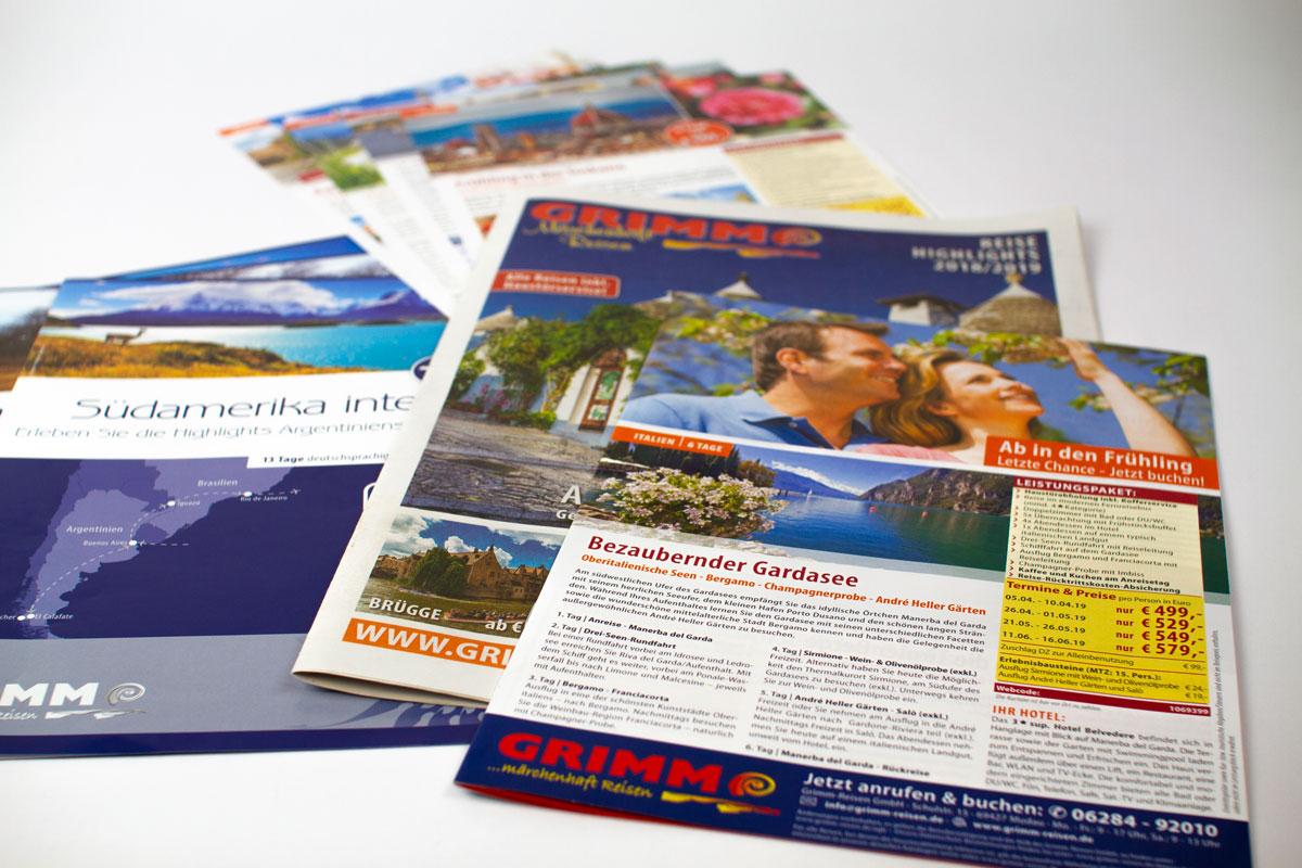 Von der kleinen Anzeige in der Zeitung bis zum mehrseitigen Reisekatalog. Für unseren Kunden GRIMM-Reisen und ihre Partnerfirmen machen wir maßgeschneiderte Werbung zielgerichtet für jede Reise.