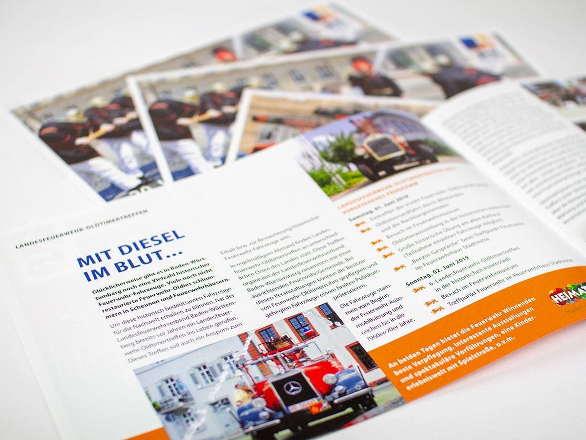 Die beiden Flyer im Format DinA4 quer informieren über das Oldtimertreffen und den Handdruckspritzen-Wettbewerb in 2019 in Winnenden. Die beiden Flyer bilden die Grundlage für weitere Flyer.