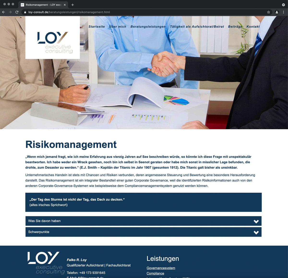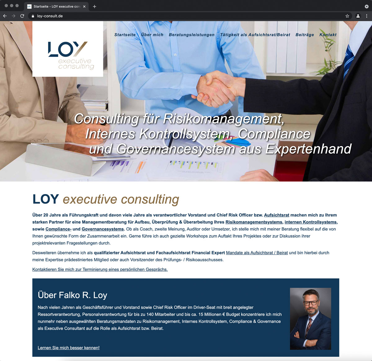 Ob als Coach, zweite Meinung, Auditor oder Umsetzer, Falko R. Loy stellt sich mit seiner Beratung flexibel auf die von Ihnen gewünschte Form der Zusammenarbeit ein. Weitere Informationen finden Sie auf der Webseite