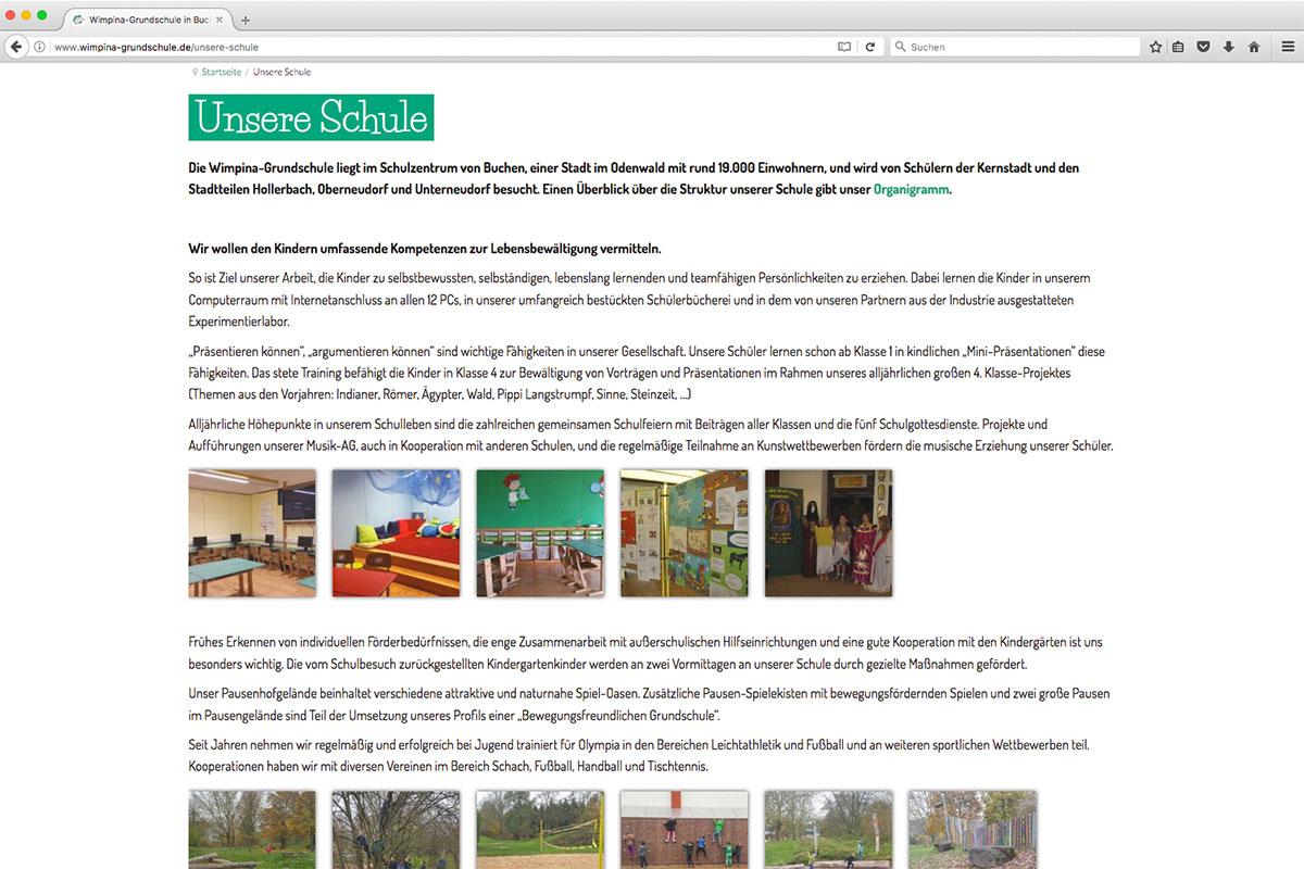 Grundschüler und vorallem deren Eltern soll die Webseite der Wimpina-Grundschule in Buchen ansprechen. Als eine von zwei Grundschulen in der Kerstadt Buchen (Odenwald) informiert die Webseite über die Angebote der Schule.