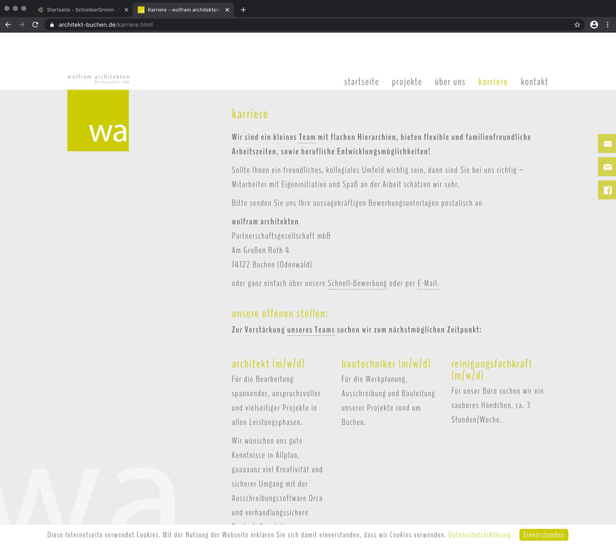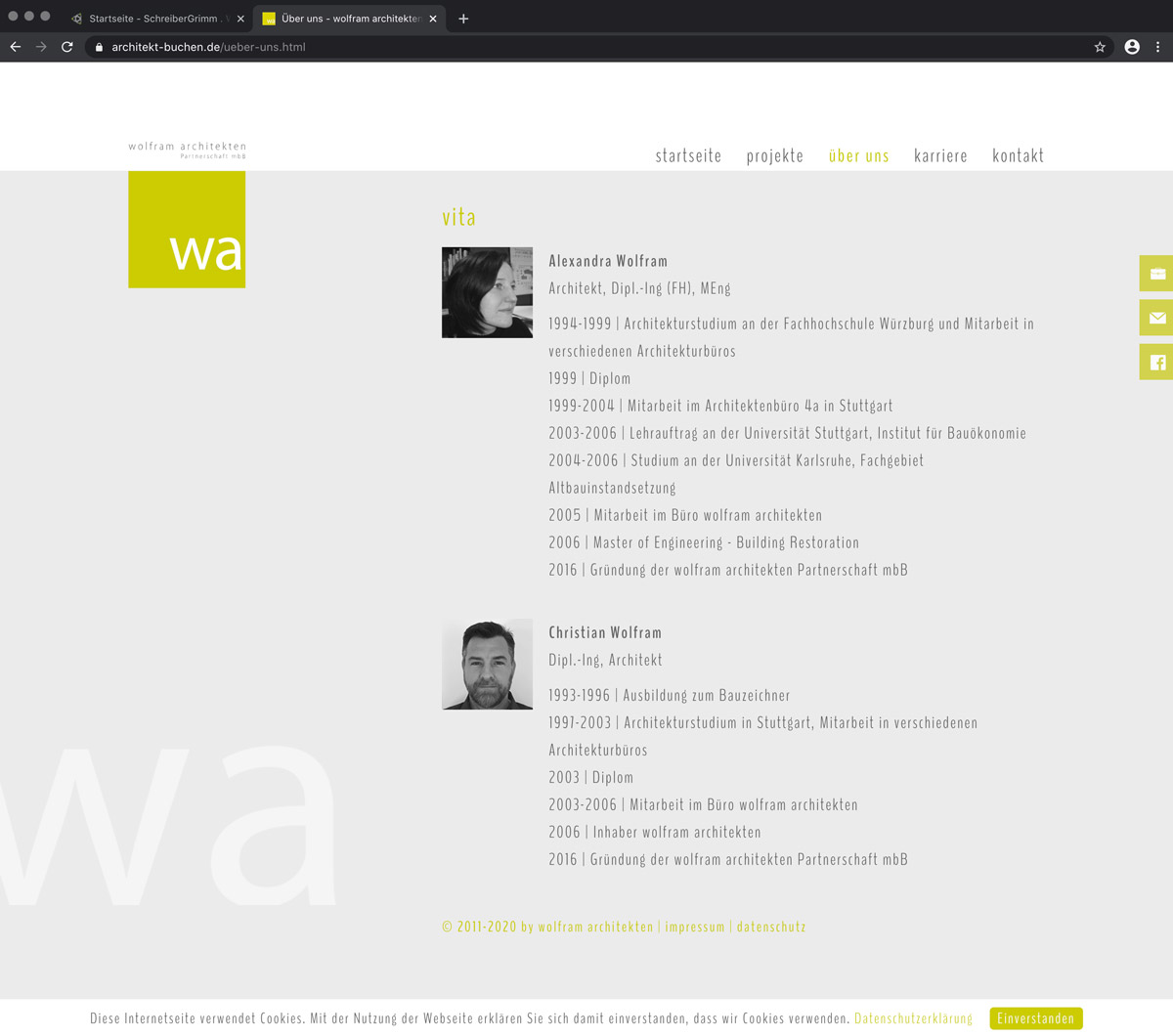 Seit 2006 wird das erfolgreich bestehende Büro unter dem Namen wolfram architekten Partnerschaft mbB von Alexandra Wolfram und Christian Wolfram weitergeführt. Von der Entwicklung eines Projektes bis hin zur Realisierung steht das Architekturbüro Ihnen mit Rat und Tat zur Seite.